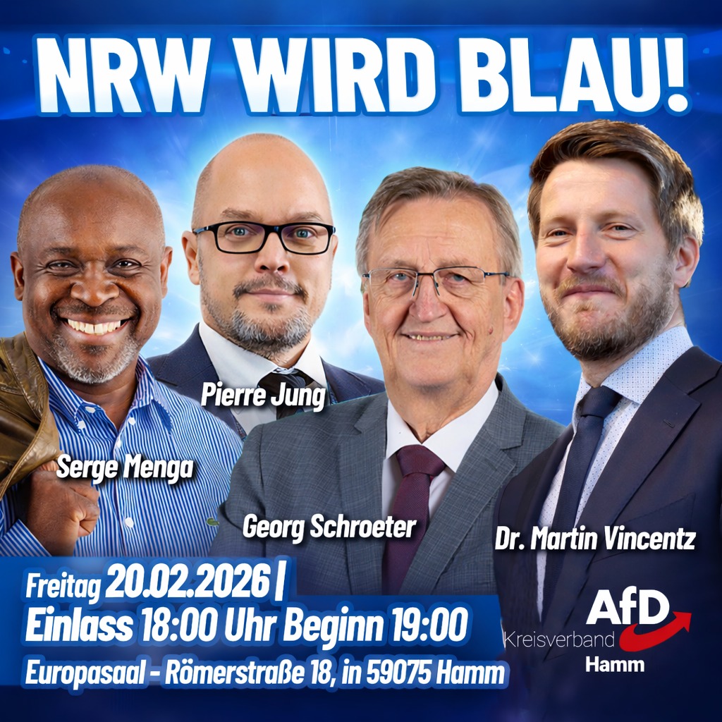 Am 10. Januar 2026 veranstaltete der AfD-Kreisverband Hamm einen politischen Nachmittag mit Sektempfang im Europasaal. Trotz widriger winterlicher Witterungsverhältnisse war der Saal gut besucht. Die anwesenden Gäste zeigten sich durchweg interessiert und aufmerksam. Im Mittelpunkt [...]