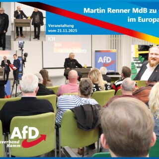 Am 21. November 2025 durfte der Kreisverband der AfD Hamm gemeinsam mit dem Kreisverband Soest den Bundestagsabgeordneten und AfD-Gründungsmitglied Martin E. Renner im Europasaal in Hamm-Bockum-Hövel begrüßen. Trotz des ersten Wintereinbruchs war der Saal sehr gut gefüllt – ein deutliches Zeichen für das anhaltend starke Interesse an der politischen Arbeit der Alternative für Deutschland. Ein [...]